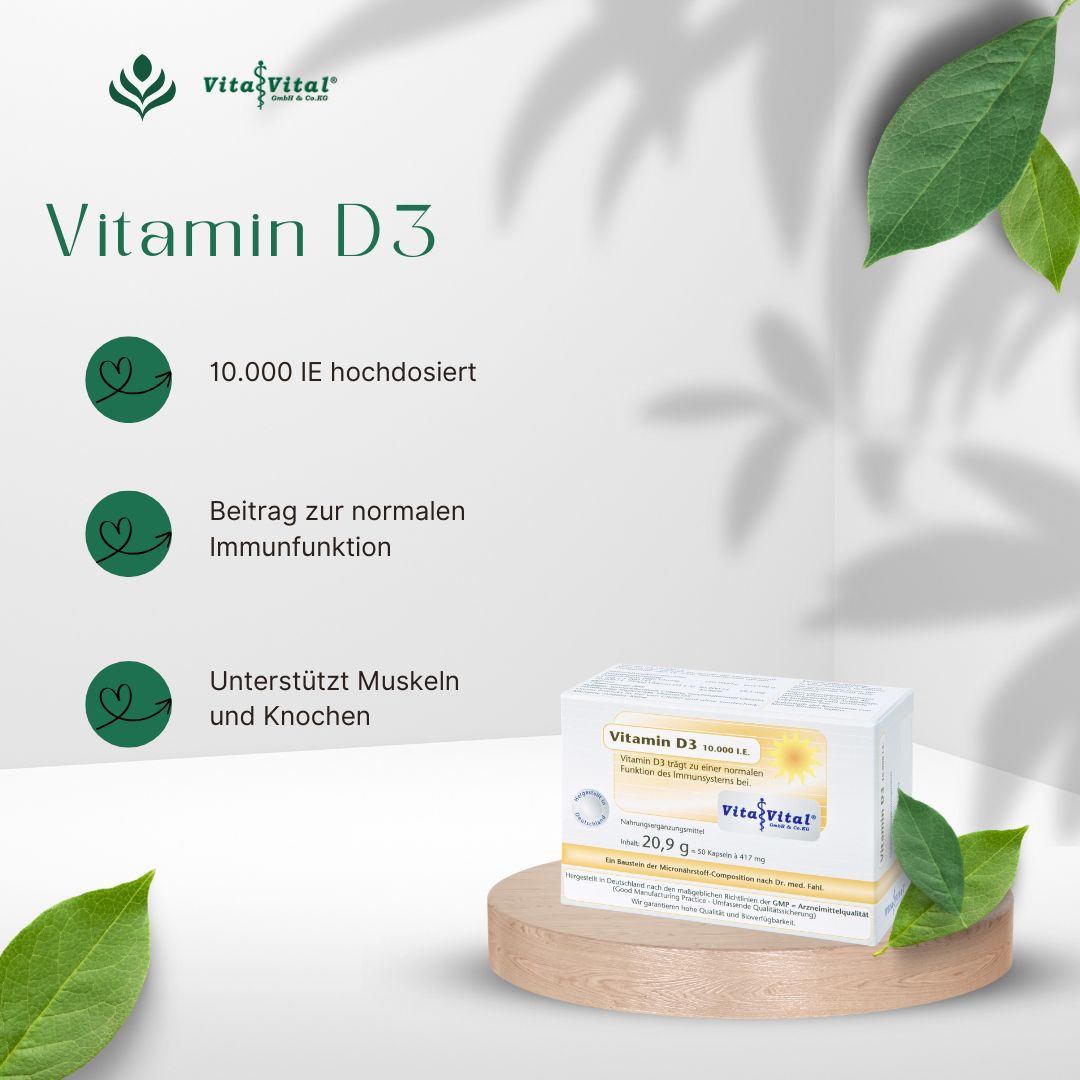 Unser hochdosiertes Vitamin D3 unterstützt deine normale Immunfunktion und trägt zur Erhaltung von Muskeln und Knochen bei.